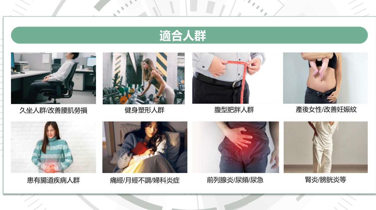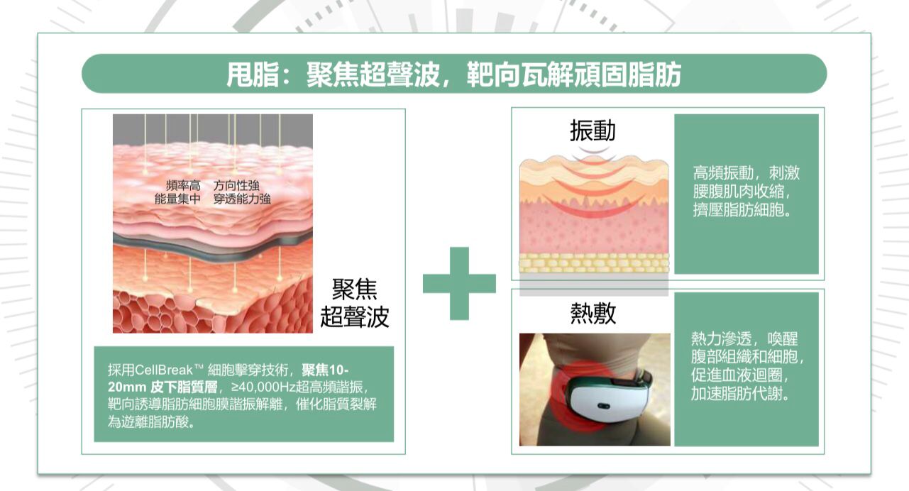技術組合:PEMF+超聲波+振動+熱敷+按摩+RF+紅光